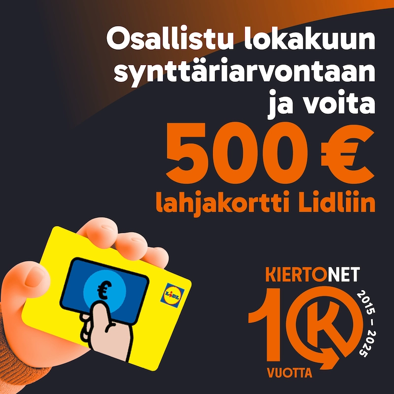 Kiertonet on täyttänyt 10 vuotta 31.8.2025! Järjestämme sen kunniaksi jo toisen arvonnan eli arvomme 500 euron Lidlin lahjakortin kaikkien rekisteröityneiden ja uutiskirjeen tilanneiden kesken.