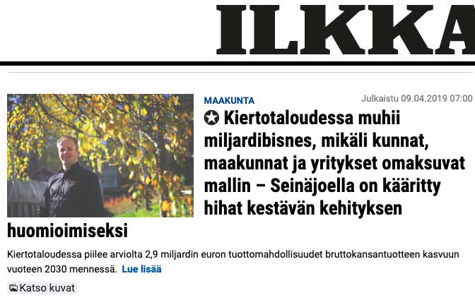 Ilkka-lehti uutisoi tänään kiertotalouden mahdollisuuksista. Jutussa kerrotaan, että materiaaleja ja palveluja kierrättämällä, jakamalla ja vuokraamalla voidaan lisätä luonnon hyvinvointia mutta myös vahvistaa taloutta ja lisätä työllisyyttä.