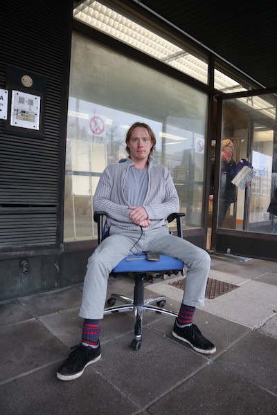 Sisäänkäynnin edustalla toimistotuolissa istuu tyytyväisen näköinen mies.