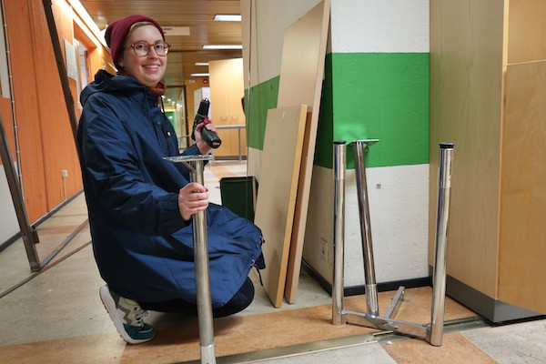 Sisällä akkuruuvivääntimen kanssa varustautunut Saara Nykänen irroittaa pöydänjalkoja kuljetusta varten.
