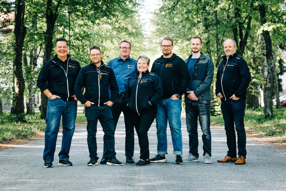Koko Kiertoa Oy:n porukka. Pasi Heikkinen, Jani Lamminmäki, Oskari Virta, Tarja Keränen, Teemu Kunto, Joonas Kämäräinen ja toimitusjohtaja Pekka Kallunki.