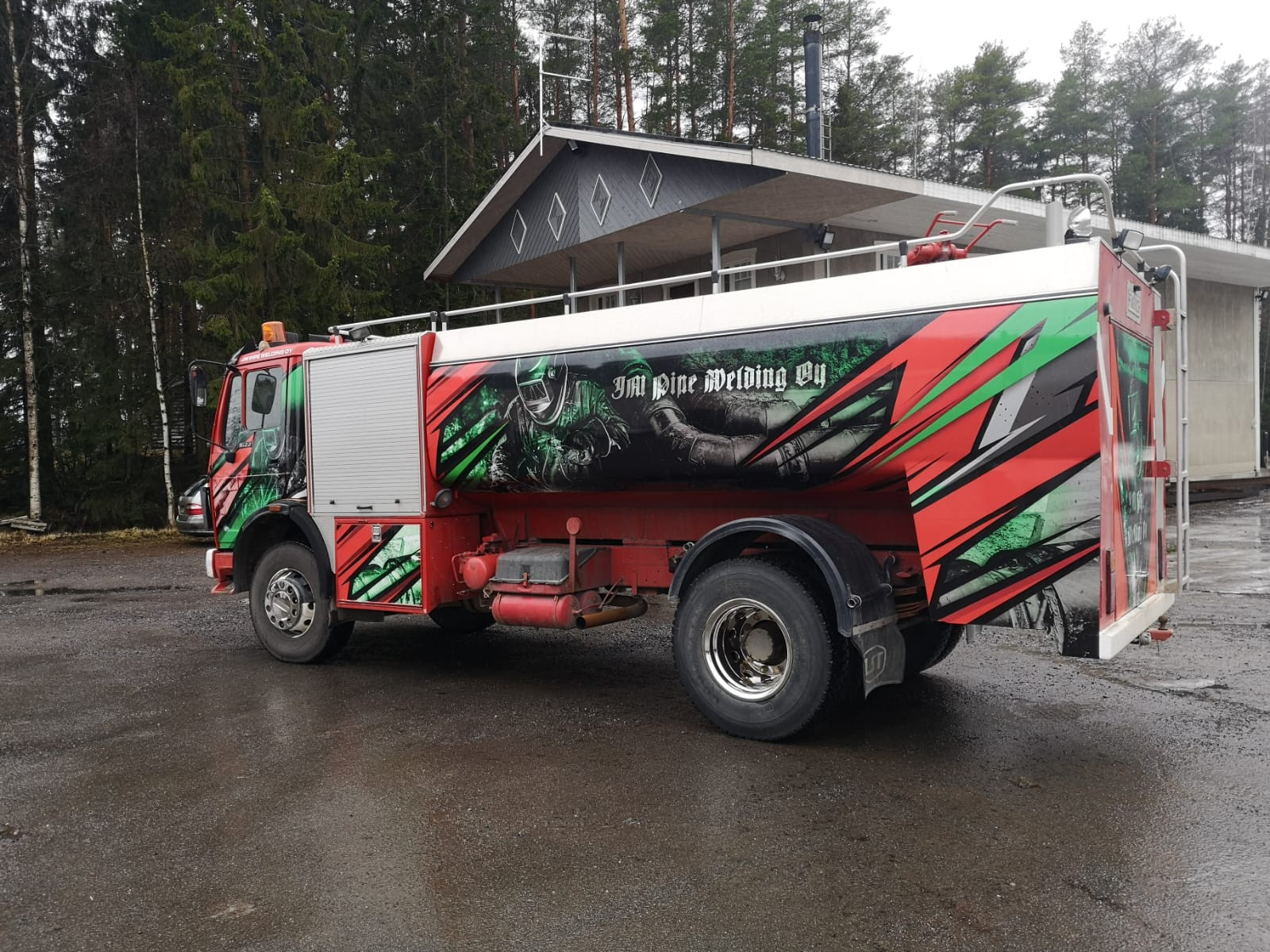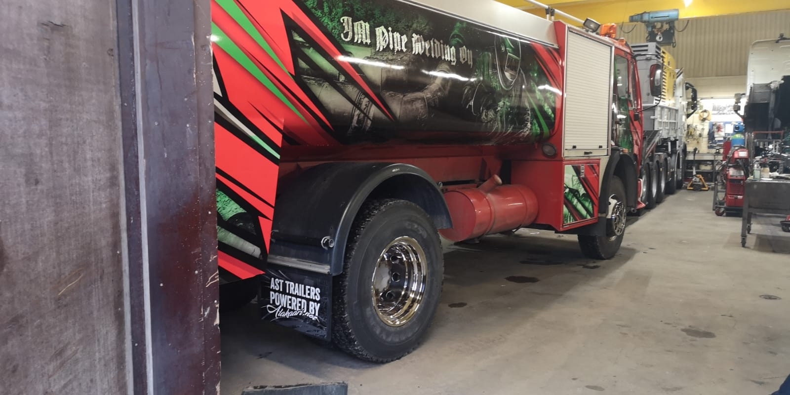 Säiliöauto sai uuden ilmeen teippauksilla, jotka suunnitteli Alakaari Oy ja toteutuksesta vastasi Raakateippi Oy.